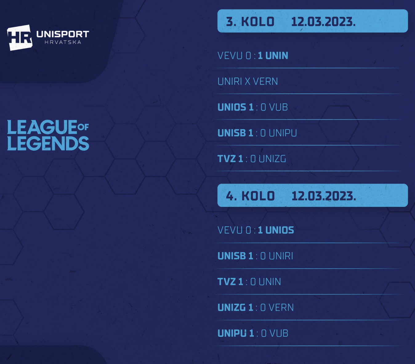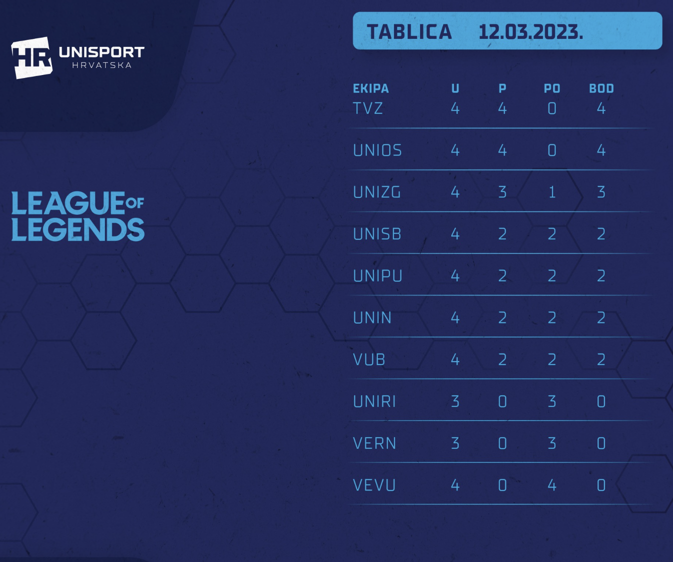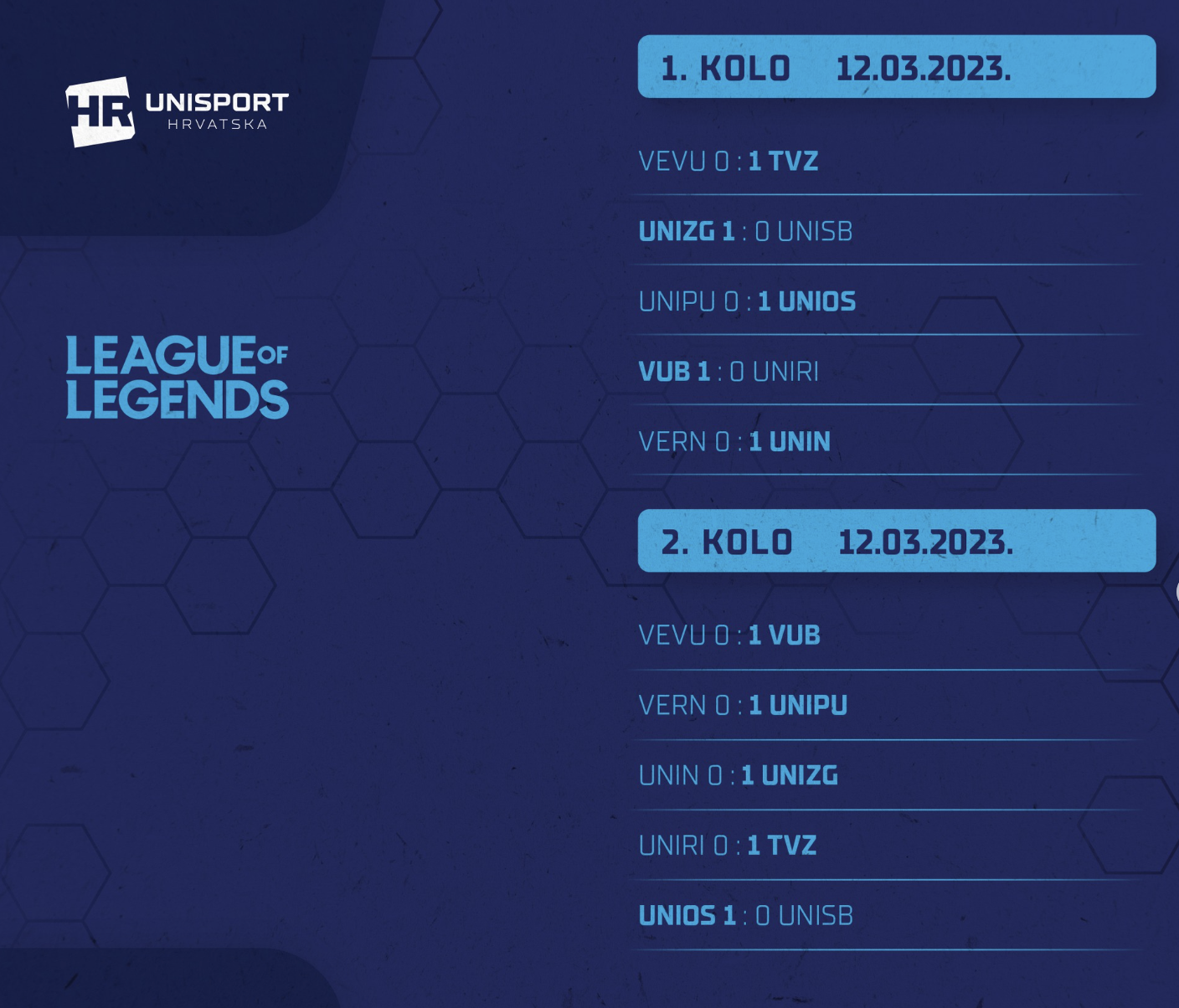 U svom prvom nastupu u igri League of Legends naši studenti su ostvarili dvije pojede i dva poraza što ih je smjestilo na sredinu tablice, dok su u igri Rocket League, uz ostvarenu pobjedu nad ekipom Sveučilišta VERN i odgođeni susret protiv ekipe Sveučilišta u Slavonskom brodu, zauzeli treće mjesto na tablici.